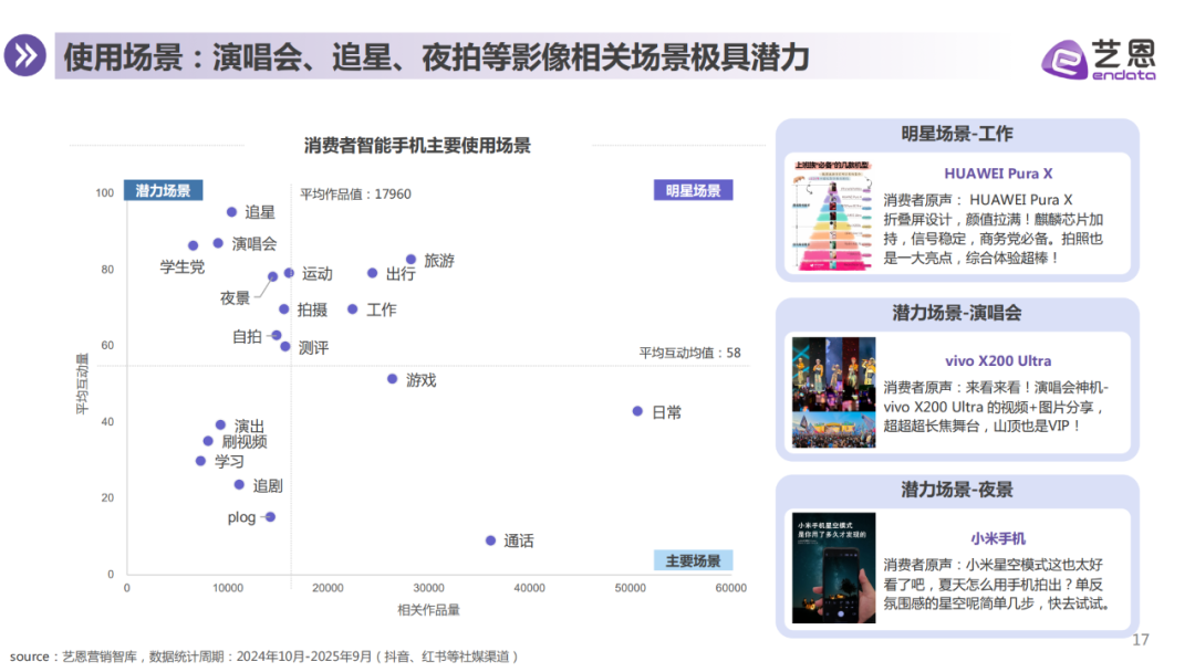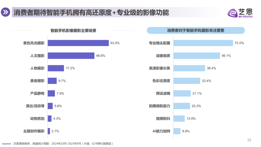 消费者购机行为日趋理性,重点关注拍照功能、价格与续航表现,并分化为时尚拍照党、游戏玩家、科技先锋等多元群体。影像真实还原与专业级拍摄体验成为核心诉求,演唱会、夜拍等场景潜力突出。