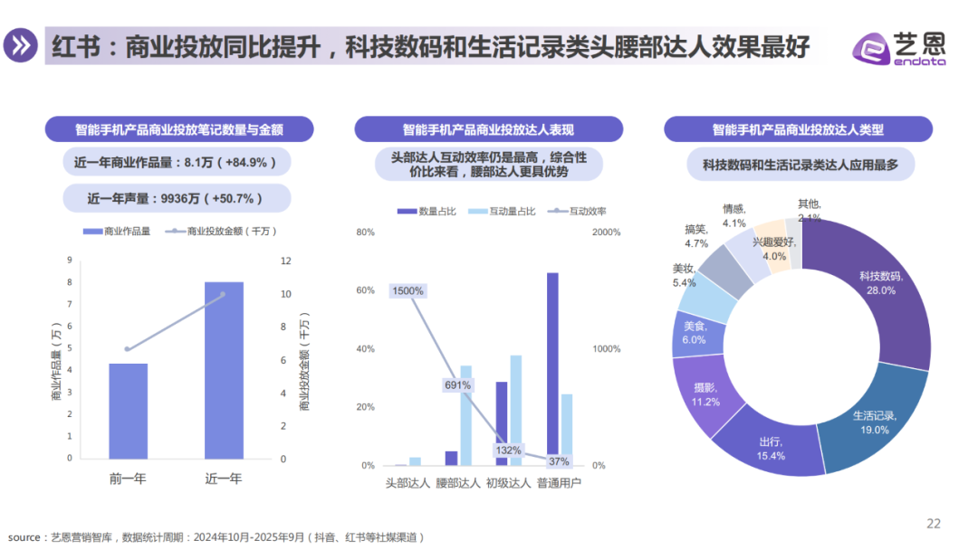 营销层面,红书与抖音成为主流投放阵地,科技数码与生活类达人带动高互动,内容以拍照体验、性能讲解、创意剧情为主,vivo、OPPO、荣耀等品牌通过场景化种草策略,有效激活用户购买意愿。